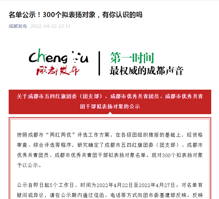 喜報我公司楊春鋒同志在成都市“兩紅兩優(yōu)”評選工作中,被評為成都市優(yōu)秀共青團(tuán)員,現(xiàn)于“成都發(fā)布”官方平臺進(jìn)行公示。楊春鋒總經(jīng)理助理?xiàng)畲轰h同志,于2016年畢業(yè)于四...